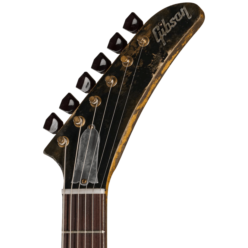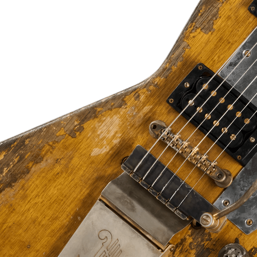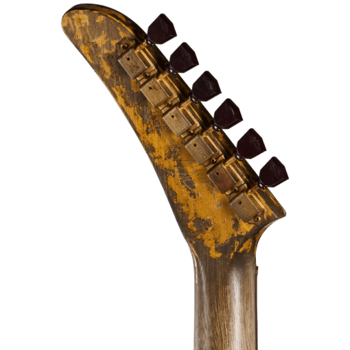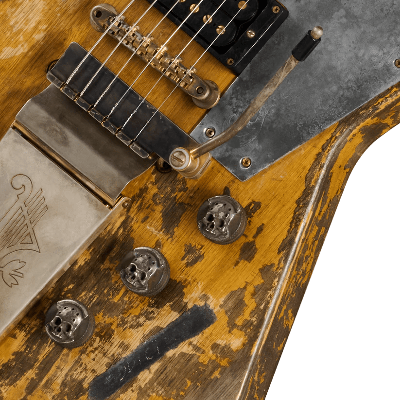 Con un acabado Dark Natural y tratamiento Ultra Aging «plus plus», la Leo Scala Dark Addiction Explorer representa una de las colaboraciones más impactantes de la serie. Notarás que su acabado cambia sutilmente de una presencia sombría y discreta a un ámbar brillante bajo las luces del escenario. Uno de los principales detalles que definen la guitarra es la distintiva hendidura del mástil en el cuarto traste, similar al desgaste de la guitarra «Big Ed», lo cual demuestra la atención de Leo al detalle. La combinación de pastillas difiere aquí, ya que las humbuckers Retrophonic de bobinado manual de Scala utilizan un imán de Alnico 2 en el mástil y uno de Alnico 5 en el puente, complementados con herrajes de oro envejecido.