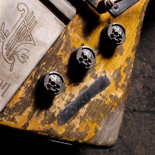 Finalmente, la Leo Scala Maestro Addiction Explorer es la interpretación más radical de la colección, con un acabado personalizado estilo «Rat Rod». Probablemente notarás que esta guitarra presenta un envejecimiento particularmente agresivo. Pero no se trata solo del envejecimiento de la laca y la madera. Esta guitarra también reemplaza los componentes de plástico tradicionales con detalles metálicos personalizados, incluyendo un golpeador metálico, una placa de jack metálica, una tapa de control metálica grabada, perillas metálicas con forma de calavera y una arandela metálica para interruptores con la etiqueta «Hell/Back».