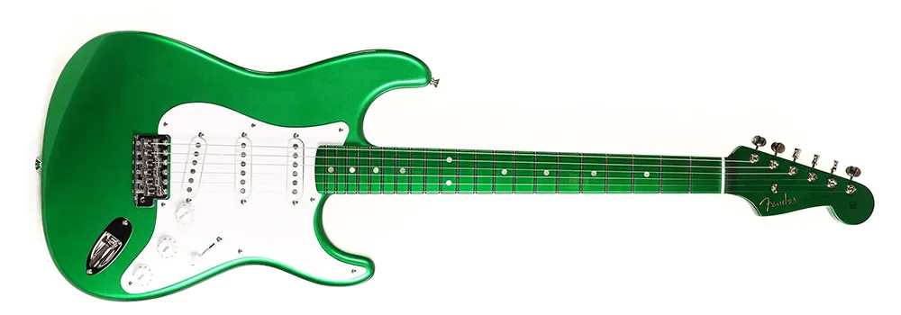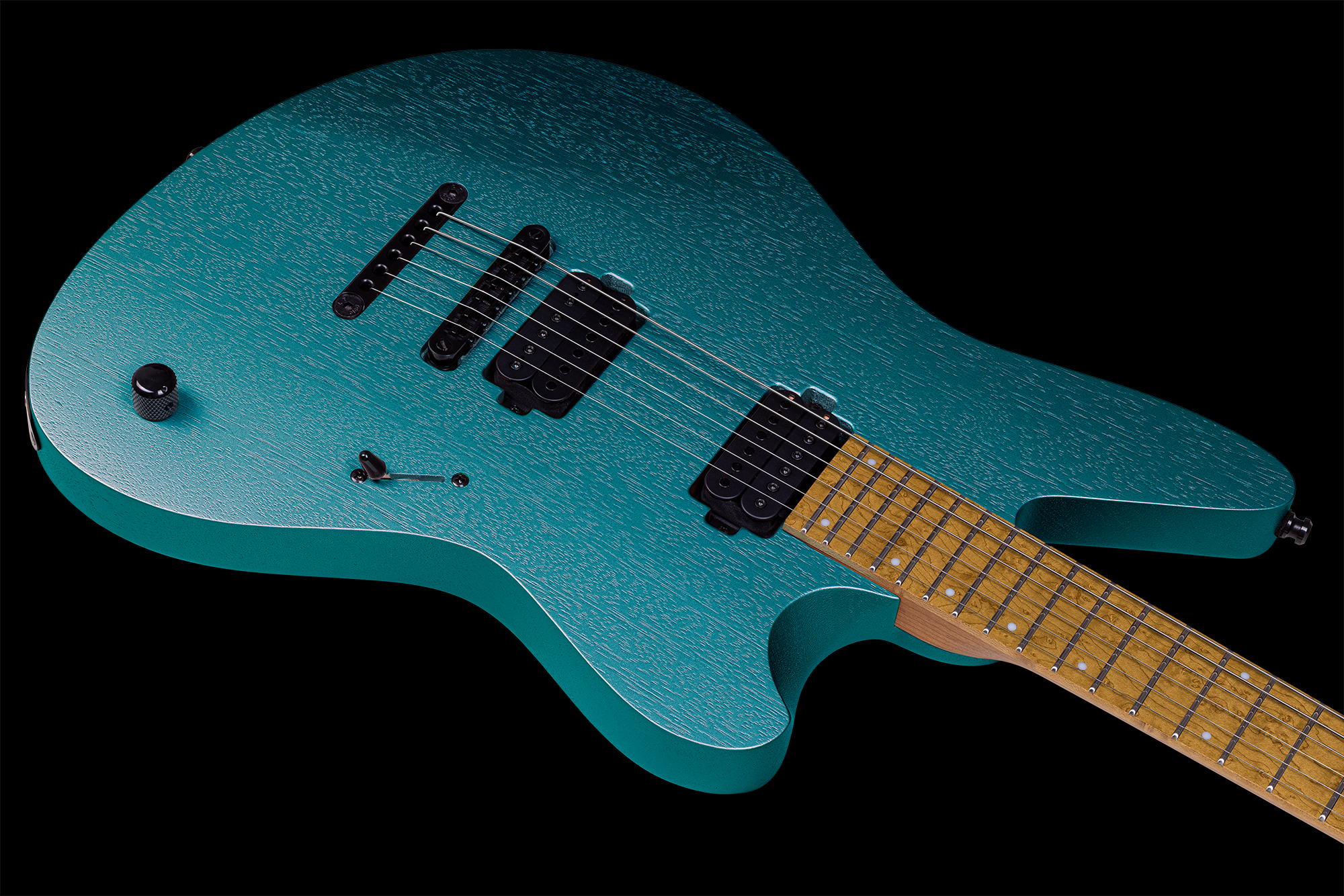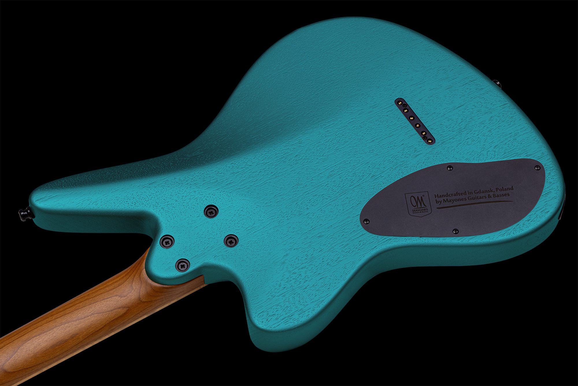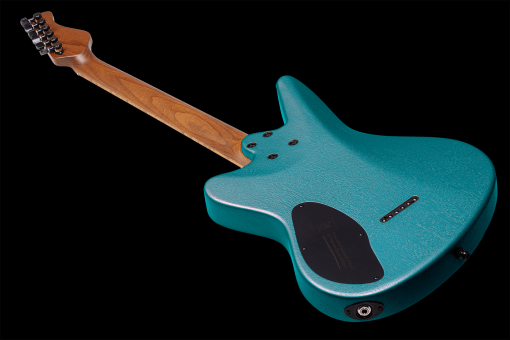 El hardware, en negro, se compone de un puente Mayones Tune-O-Matic, clavijero Hipshot Grip-Lock con bloqueo y sujeciones de correa Schaller Security Straplocks.