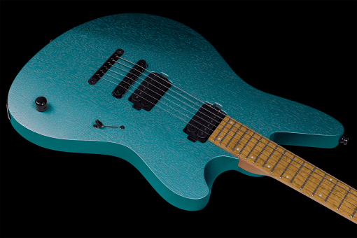 Incorpora un cuerpo de okume con un talón muy rebajado en esta construcción de mástil atornillado. El mástil es de arce con refuerzos de grafito, mientras que el diapasón es de arce ojo de pájaro TEW (Tonally Enhaced Wood) y radio 12″ con 24 trastes extra jumbo Ferd Wagner de acero, mientras que la cejuela es una Graphtech Black Tusq XL y los marcadores offset se complementan con los laterales Luminlay.