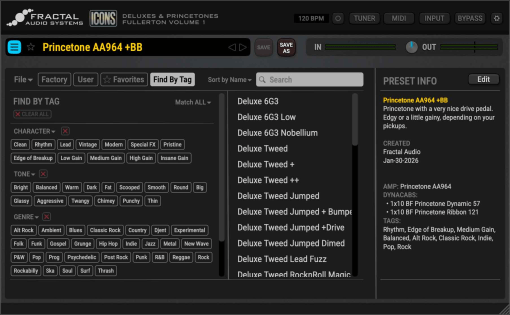 ICONS lleva el modelado de amplificadores de Fractal Audioal mundo de los plugins y a tu escritorio como una aplicación independiente. Basado en los mismos algoritmos que el galardonado Axe-Fx, ICONS ofrece el sonido y la sensación inconfundibles de Fractal Audio, ahora para la grabación moderna y los flujos de trabajo informáticos. ICONS es una serie, y el primer lanzamiento es The Fullerton Collection, basada en los mejores amplificadores de estilo americano de Fullerton, California, de los años 50, 60, 70 y posteriores.