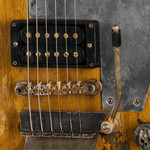 Un cordal Maestro Vibrola personalizado, modificado por Leo según su propio estilo, es una gran adición a la guitarra, ya que la palanca de vibrato a medida es completamente única. Las pastillas humbucker Retrophonic están presentes, con un imán de Alnico 2 en el mástil y una pastilla de puente de Alnico 5, ambas con bobinas dobles negras descubiertas. Están cableadas a mano con un estilo de los años 50 y cuenta con potenciómetros VIPots de 550k con conicidad vintage.