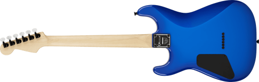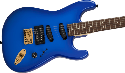 La Jake E Lee Pro-Mod Signature Blue Burst cuenta con un cuerpo de aliso, mástil atornillado de arce de corte radial y diapasón de palisandro con radio compuesto de 12″-16″, 22 trastes medium jumbo e incrustaciones de puntos blancos.