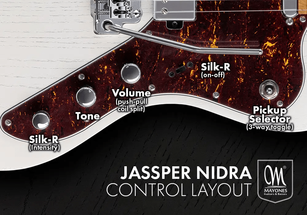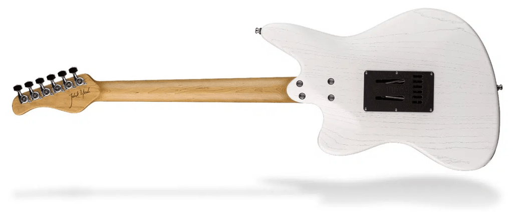 La nueva Mayones Jassper Nidra tiene un cuerpo de fresno (acabado Monolith Retro White) con un talón esculpido para un mejor acceso a los trastes superiores.