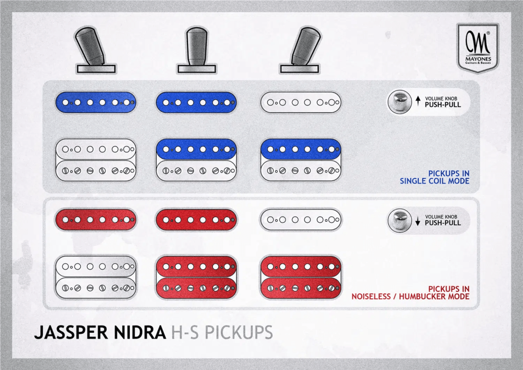 La configuración de pastillas es HS, con una Velvetrone Ironside y una Exile, que en realidad es la pastilla Jakub Żytecki Signature (noiseless). Para controlar todo el tono monta un control de volumen (push-pull), un control de tono (pasivo) y un Silk-R Intensity, además de un selector de tres posiciones.