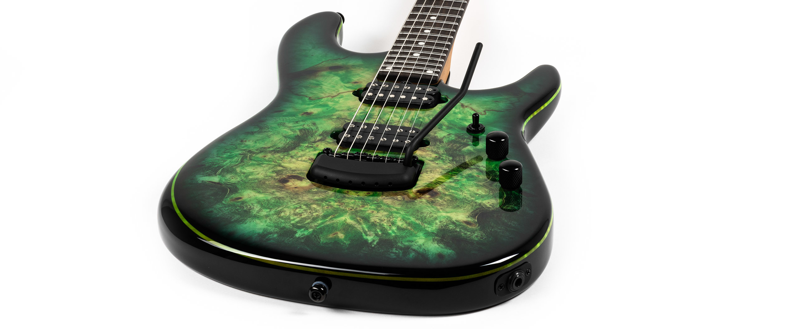 Con su cuerpo de aliso y su impresionante tapa de castaño de Indias, las guitarras Cutlass ofrecen una combinación de ligereza y delicadeza tonal. El mástil de arce tostado no solo proporciona un aspecto atractivo, sino que también ofrece una excelente facilidad de ejecución. Alternativamente, puede optar por el mástil de arce blanco con un diapasón de ébano.