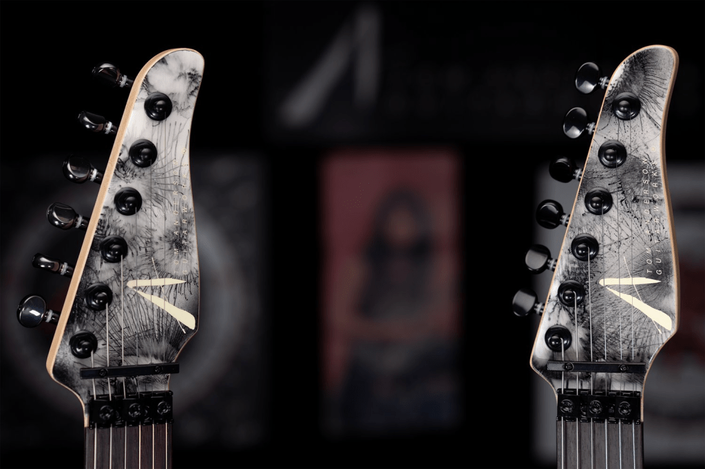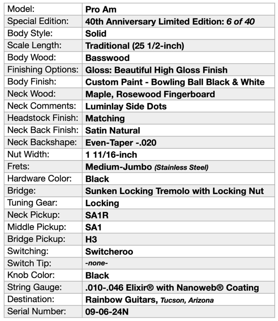 La Anderson Pro Am original, y aún muy popular, es un modelo golpeador con un cuerpo sin tapa de arce. Estos cuerpos de madera de tilo están embellecidos con acabados personalizados Bowling Ball Black & White son únicos, no hay dos iguales.