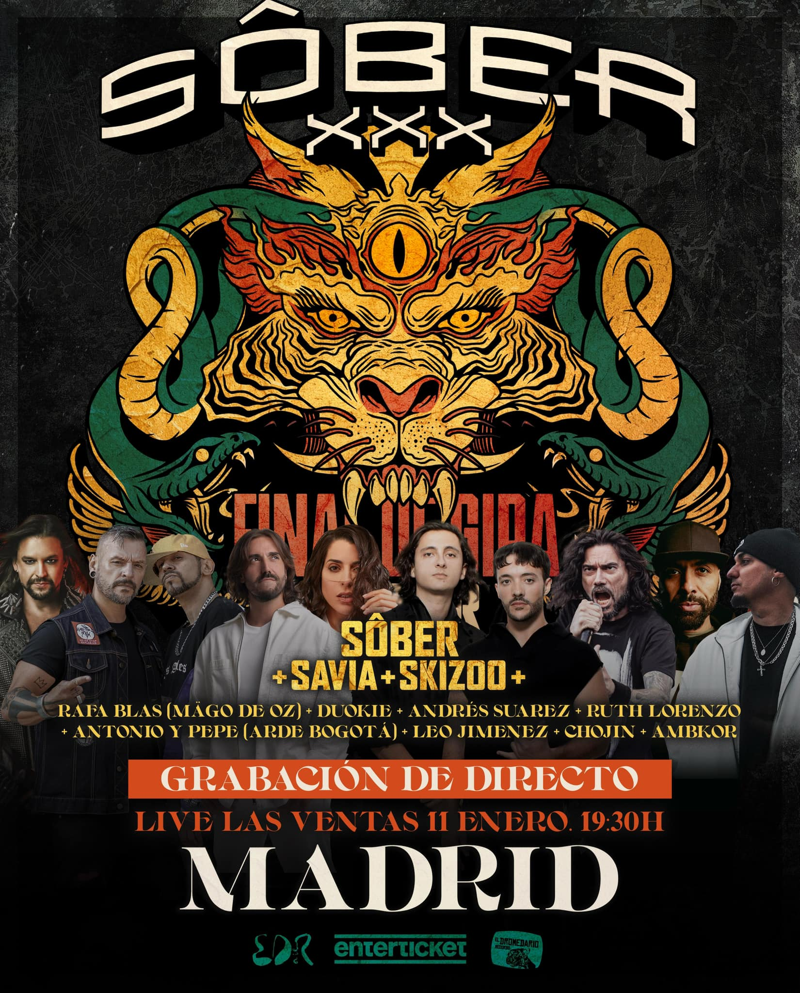 Un año después de que arrancara en Madrid la Gira XXX Aniversario de Sôber, Savia y Skizoo la legendaria tripleta de bandas regresará a Live Las Ventas para despedirla: para despedir un tour que ha deparado grandes alegrías a los músicos y al público que durante 2024 ha asistido a los conciertos, colgándose el cartel de ‘sold out’ en casi todos los recintos. En este concierto, que también se ha anunciado que se grabará para posteriores lanzamientos, no faltarán los himnos con los que Sôber han trascendido de aquí a la eternidad.