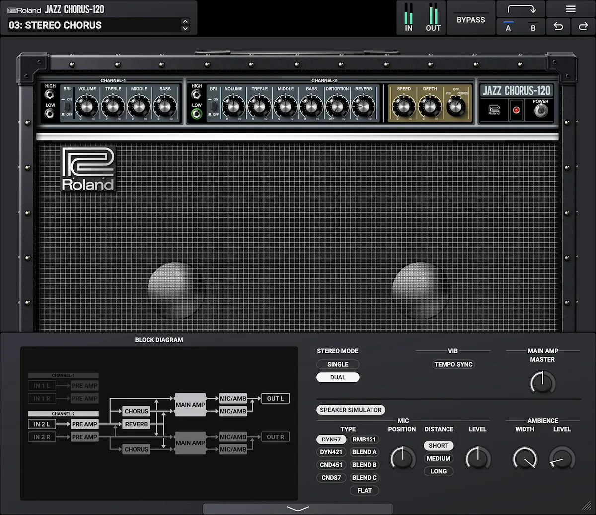 Aunque el amplificador/chorus original sigue en producción, el nuevo complemento recrea su sonido y carácter «a través de un análisis profundo de los circuitos originales». Obtienes tanto el sonido potente y ultralimpio (tal como se creó originalmente utilizando un sistema de amplificación estéreo integrado y altavoces personalizados de 12 pulgadas) junto con el evocador Dimensional Space Chorus, un efecto que en realidad se presentó por primera vez al mundo a través del hardware original.