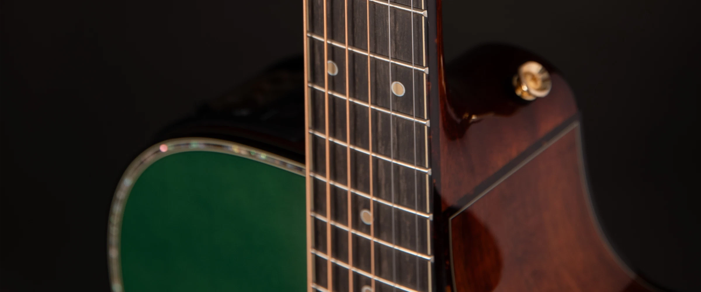 El diapasón y el puente están hechos de ébano, y el diapasón tiene incrustaciones de círculos de latón que envejecerán de forma única, lo que se suma a la naturaleza atemporal de esta guitarra.