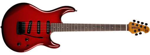 La Lukather Collection 2025 también tiene algo para los amantes de la configuración clásica de tres pastillas single coil. El modelo está disponible en Scoville Red por 3549 €. La guitarra viene con un cuerpo de aliso tostado, diapasón de palisandro, 22 trastes, tres pastillas Music Man HT de bobina simple y un preamplificador activo Custom Music Man.