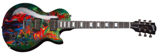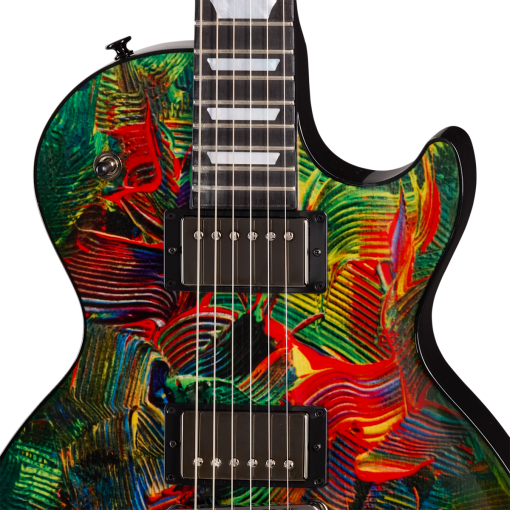 La Les Paul Modern «Foundations» de Serj Tankian cuenta con un cuerpo de caoba ultramoderno con aligeramiento de peso y una tapa de arce veteado AAA con una obra de arte personalizada impresa por sublimación basada en la pintura «Sunburst» de Serj Tankian y ribete de una sola capa.