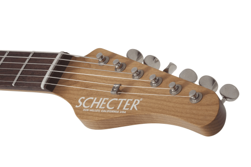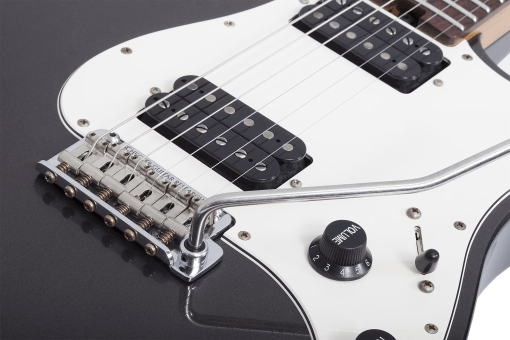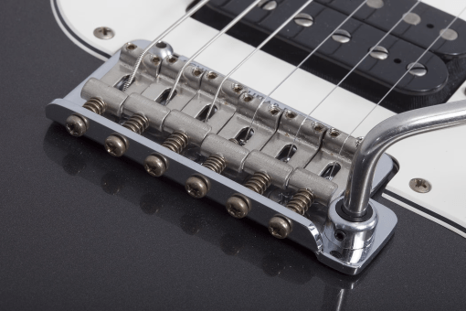 La Schecter Schecter USA Sunset Custom Wembley HH tiene un cuerpo de aliso con la típica construcción bolt-on y un sobrio acabado Charcoal Metallic Aged Nitro. A juego con el acabado, todo el hardware es aged chrome, incluyendo el trémolo Gotoh 510.