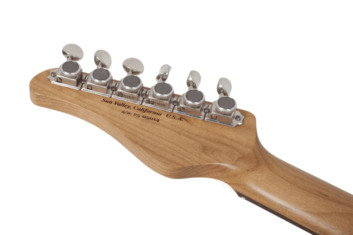 El mástil es de arce roasted con perfil Custom C un diapasón de palorrosa de radio 12″ sobre el que están montados 22 trastes Jescar Stainless Steel, una cejuela GraphTech Black Tusq y un clavijero Gotoh Vintage Locking.