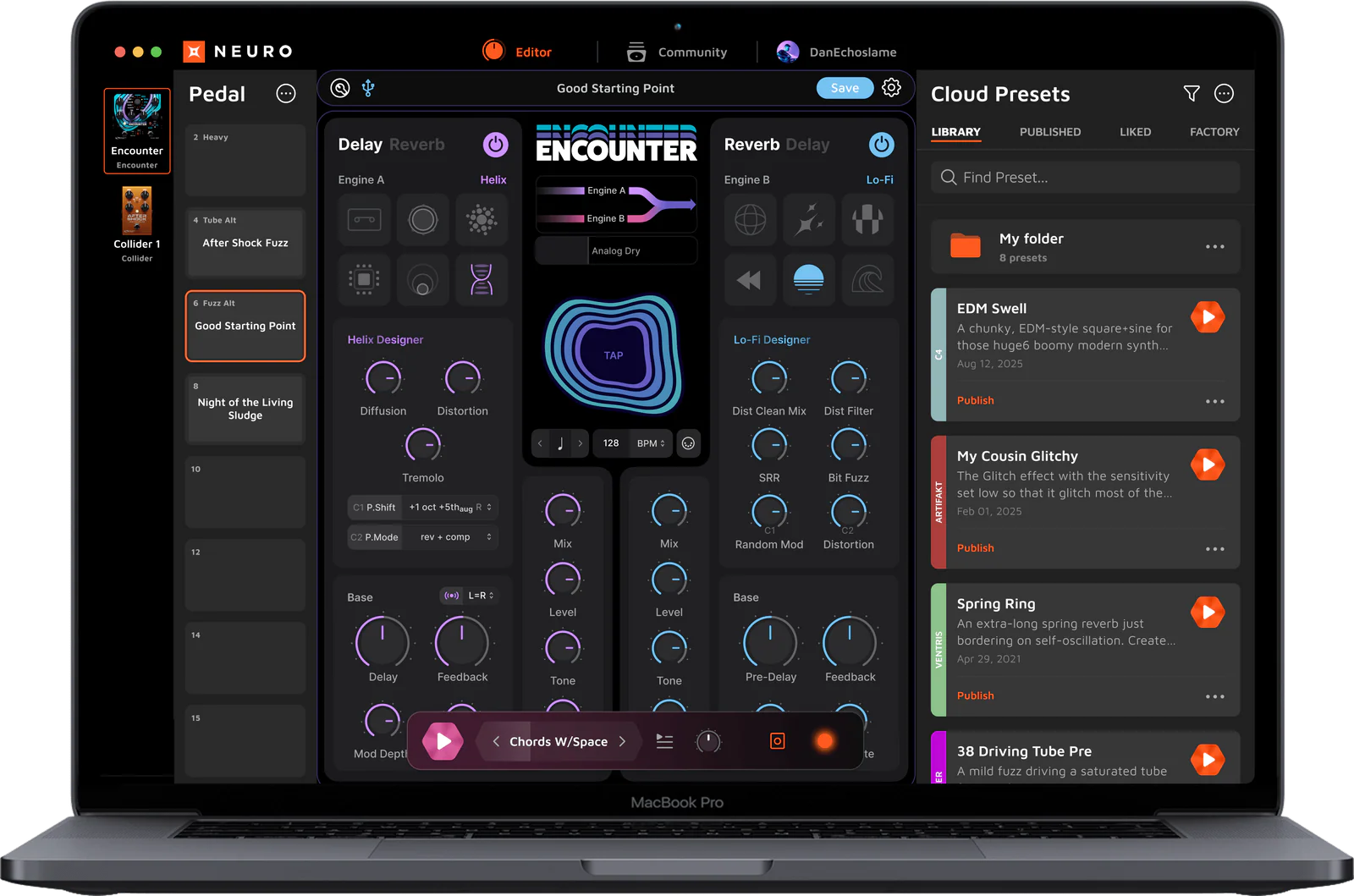 El Encounter se basa en esto. Piénsalo como una remodelación evolutiva del Collider, que nos presenta seis motores de delay, seis reverbs, cada lado del pedal con su propio pedal multifunción, y cuenta con algoritmos completamente nuevos que nos ofrecen sonidos realmente increíbles.