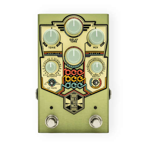 El pedal Bee Bee Dee se controla mediante los controles Tono, Tiempo de Delay, Mezcla, Actividad y Profundidad. Puedes alternar entre tres modos de delay mediante un miniinterruptor de 3 posiciones.