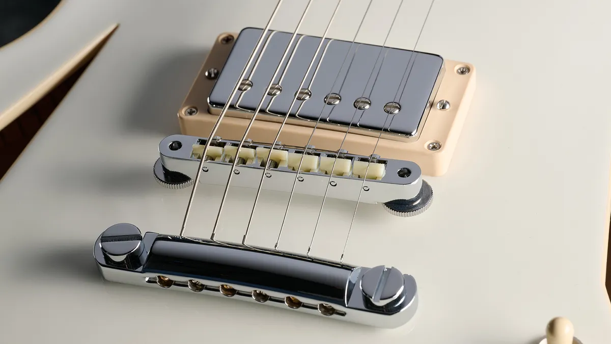 El hardware incluye un puente TonePros ABR-1 con selletas de nailonun cordal TonePros Stop Bar con bloqueo y pastillas Custombuckers sin encapsular con imanes Alnico 3 envejecidos. La electrónica está cableada con potenciómetros CTS, condensadores de papel en aceite y un selector de tres posiciones Switchcraft. La configuración se completa con botones dorados Gold Top Hat con reflectores plateados.