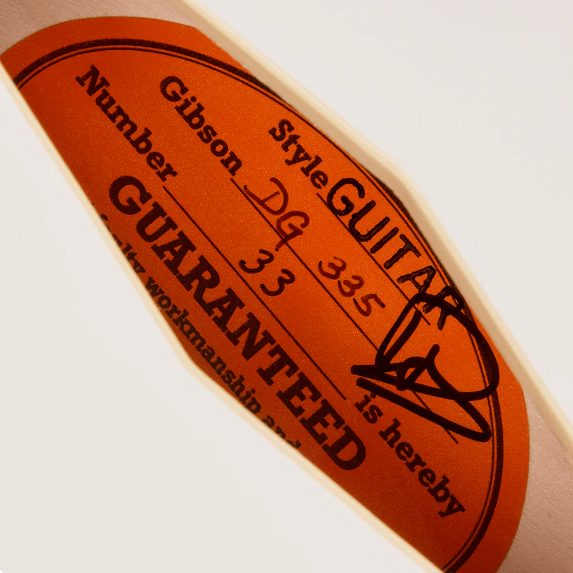 Cada Dave Grohl DG-335 viene de fábrica con un estuche rígido producido por Gibson Custom y cuenta con una etiqueta firmada por Dave Grohl ubicada en una de las aberturas de sonido en forma de diamante.