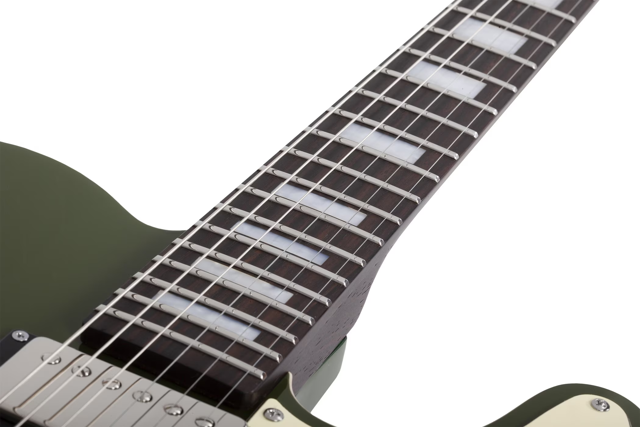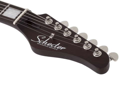 El mástil es de wenge reforzado con varillas de carbono y con un diapasón de ébano con radio 14″ que incorpora marcadores de bloques perlados y 22 trastes X-jumbo de acero. Los marcadores laterales son Luminlay, y la cejuela (42mm) Graph Tech XL Ivory Tusq. El clavijero es Schecter Locking con bloqueo.