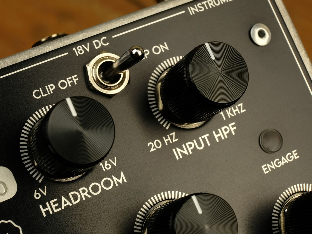 La frecuencia de corte del filtro paso alto va desde 20 Hz hasta 1 kHz, así que al subirla, estás reduciendo los graves; Y el headroom ajusta el voltaje en la segunda etapa de ganancia entre 6V y 16V, así que al subirlo, en realidad estás reduciendo el drive y la compresión.