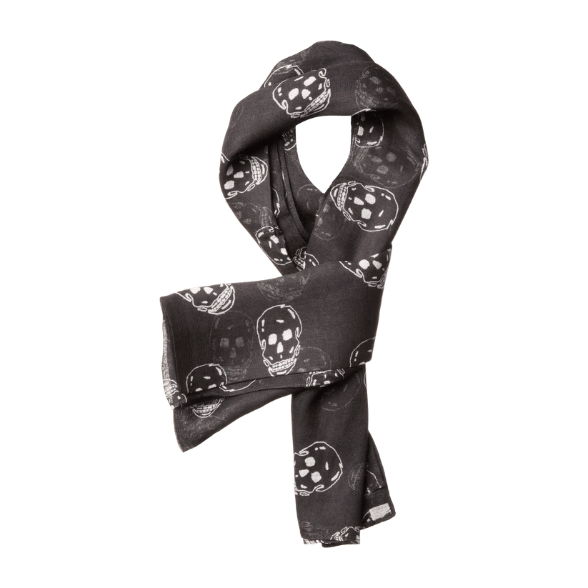 Dentro del estuche hay una correa de cuero y una bufanda negra con estampado de calaveras blancas, igual que la de Richards. Solo tienes que añadir un gorro de punto y listo.