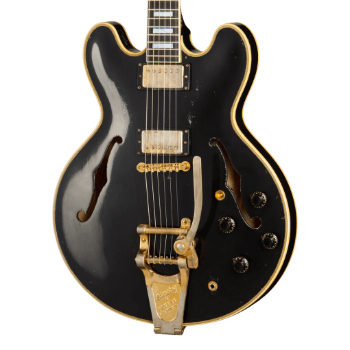 En cuanto a guitarras signature, esta es difícil de superar. La ES-355 tiene algo especial: los herrajes dorados, el estilo tuxedo de la incrustación de diamante dividido en el clavijero, el ribete multicapa y las incrustaciones de bloque en el diapasón de ébano, y el Bigsby B7 le da un toque rockero.