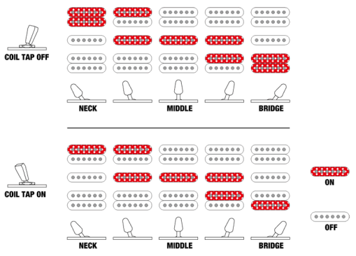 La electrónica se compone de un control de volumen, un control de tono, un selector de cinco posiciones y un miniswitch para la función coil tap que permite las siguientes selecciones: