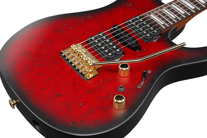 La nueva signature de Kiko Loureiro es la Ibanez KIKO300, con cuerpo de aliso y tapa de poplar con un acabado Ruby Red Sunburst Flat.