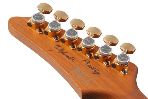 Se trata de un modelo con configuracion de pastillas HSH con un set de DiMarzio KIKO, mástil de arce roasted con diapasón de palorrosa, inlay especial KIKO, cejuela de hueso y 24 trastes jumbo de acero con tratamiento Prestige.