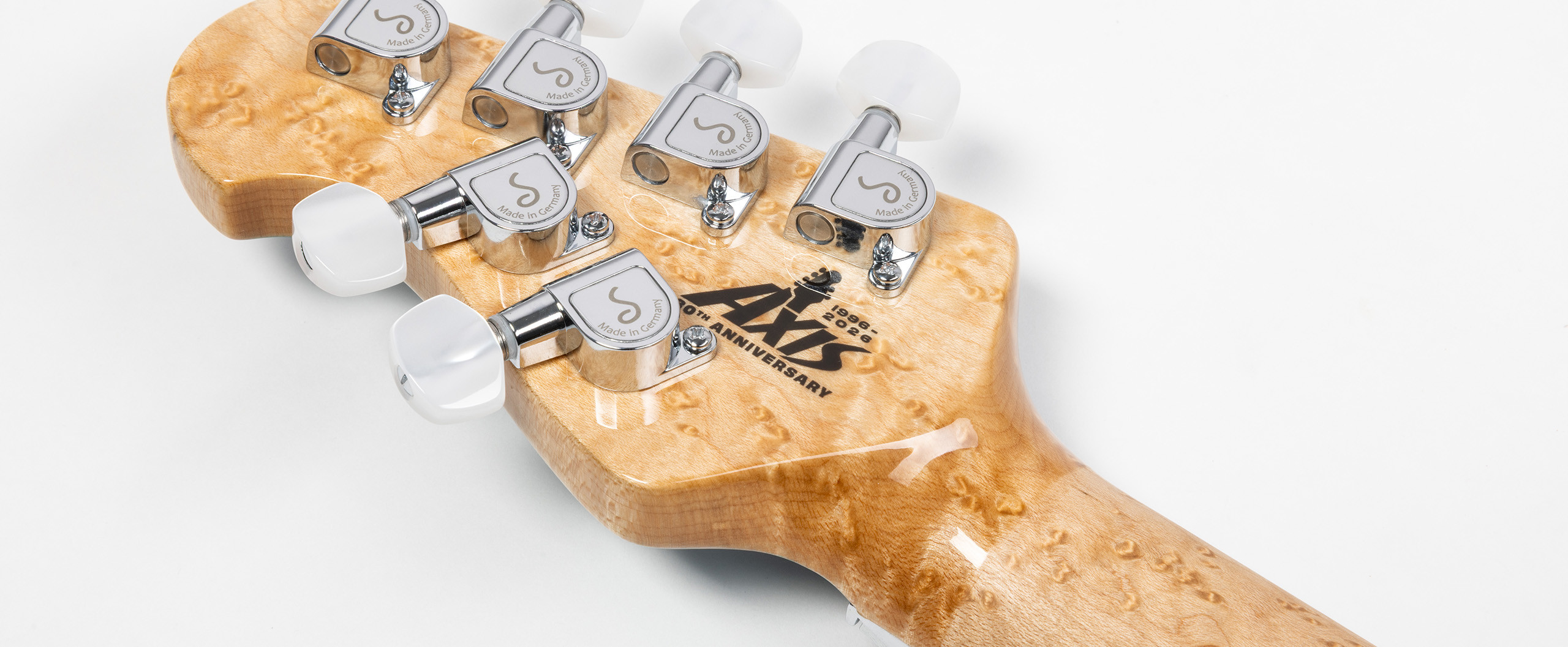 La Axis 30º Anniversary presenta una tapa de arce acolchado teñida a mano y está disponible en seis acabados traslúcidos diferentes: Gold, Black, Pink, Red, Blue y Purple, cada uno con una pala a juego. Todas los modelos incluyen una parte trasera con acabado negro brillante.