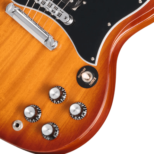 La Sadler Vaden SG Standard cuenta con herrajes cromados, incluyendo un puente Nashville Tune-O-Matic de aluminio y un cordal Stop Bar de aluminio, que permiten un ajuste completo de la altura de las cuerdas y la entonación individual.