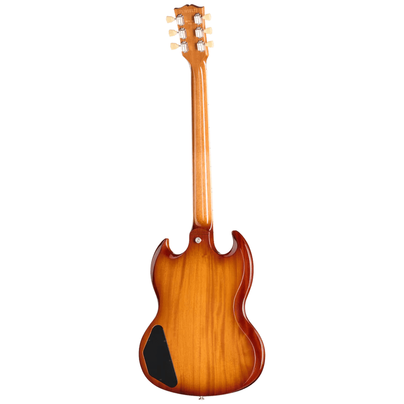 La Sadler Vaden SG Standard cuenta con un cuerpo de caoba maciza con diseño de doble cutaway y biseles profundos. El acabado Natural Burst, realizado con laca de nitrocelulosa brillante, se ha igualado cuidadosamente para capturar el tono del acabado envejecido de su guitarra, de 21 años de antigüedad, que ha adquirido un tono más cálido y marrón con el tiempo.