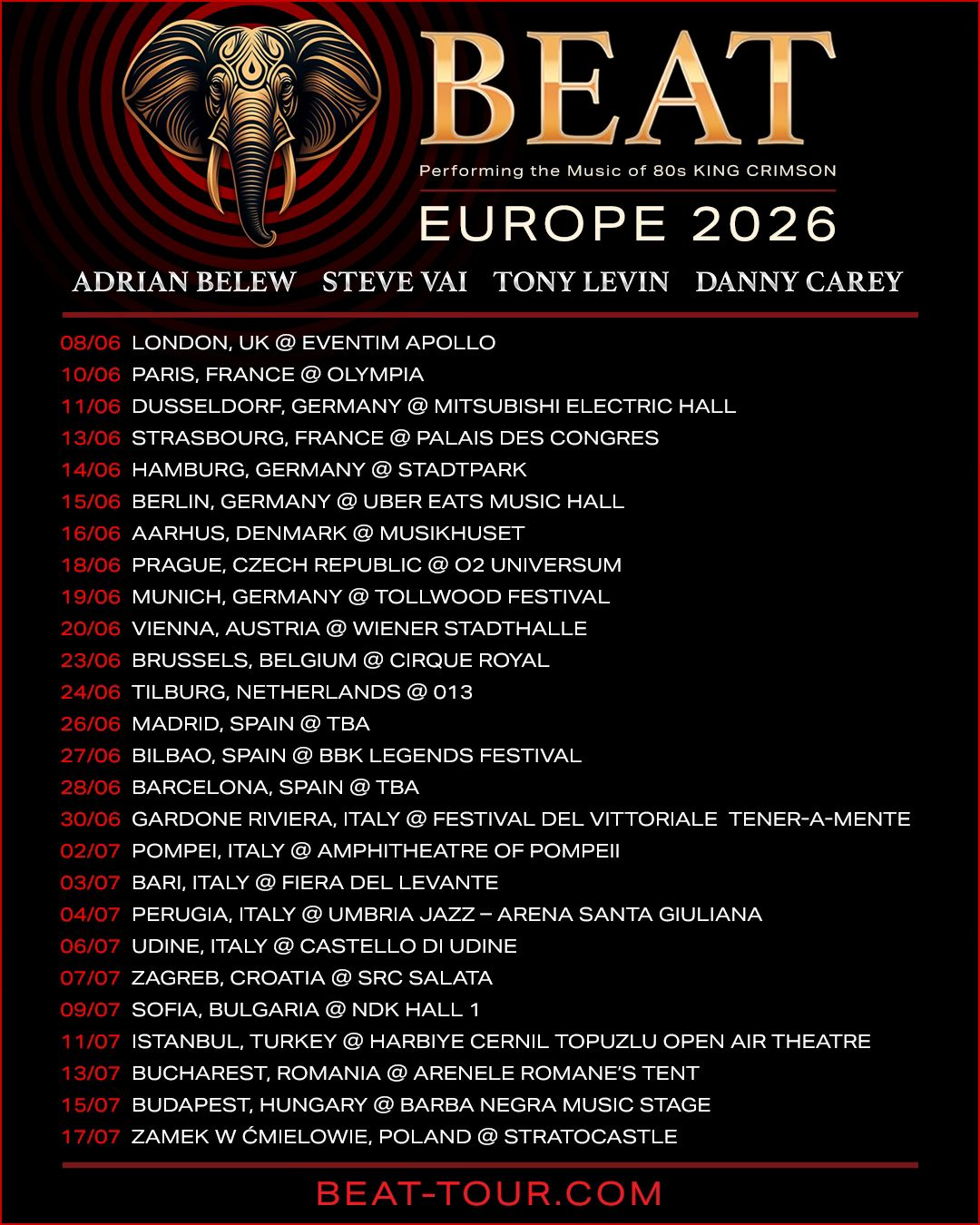 Beat, el supergrupo formado por Adrian Belew, Steve Vai, Tony Levin y Danny Carey, ha anunciado fechas de su gira europea del próximo año.