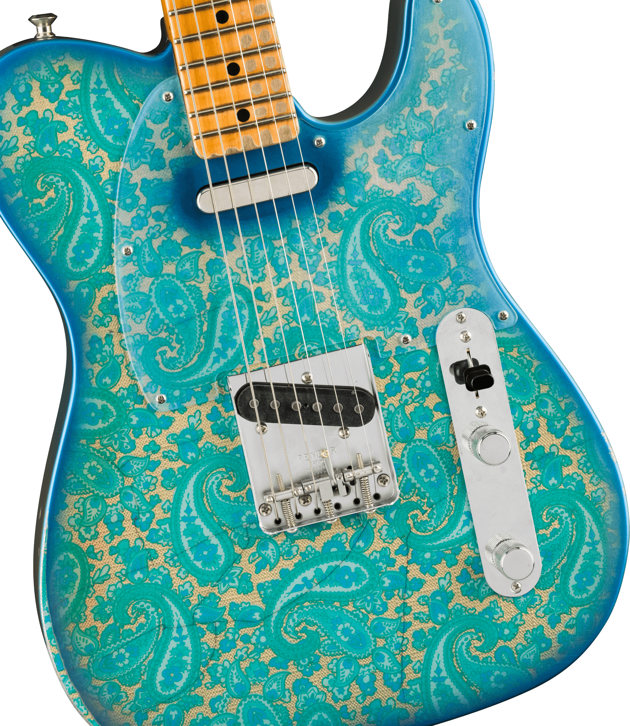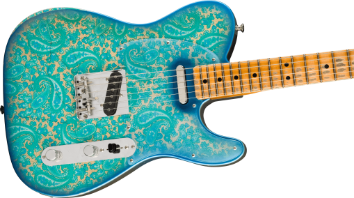Además de su llamativo acabado Blue Paisley Relic, está completamente equipada con un mástil de arce ovalado «C» de los años 60 con diapasón de arce laminado redondo, pastillas Seymour Duncan Custom Shop Hand-Wound Lost Paisley y un sistema Glaser «G» Bender para unos bendings fluidos, similares a los de una guitarra de pedal.
