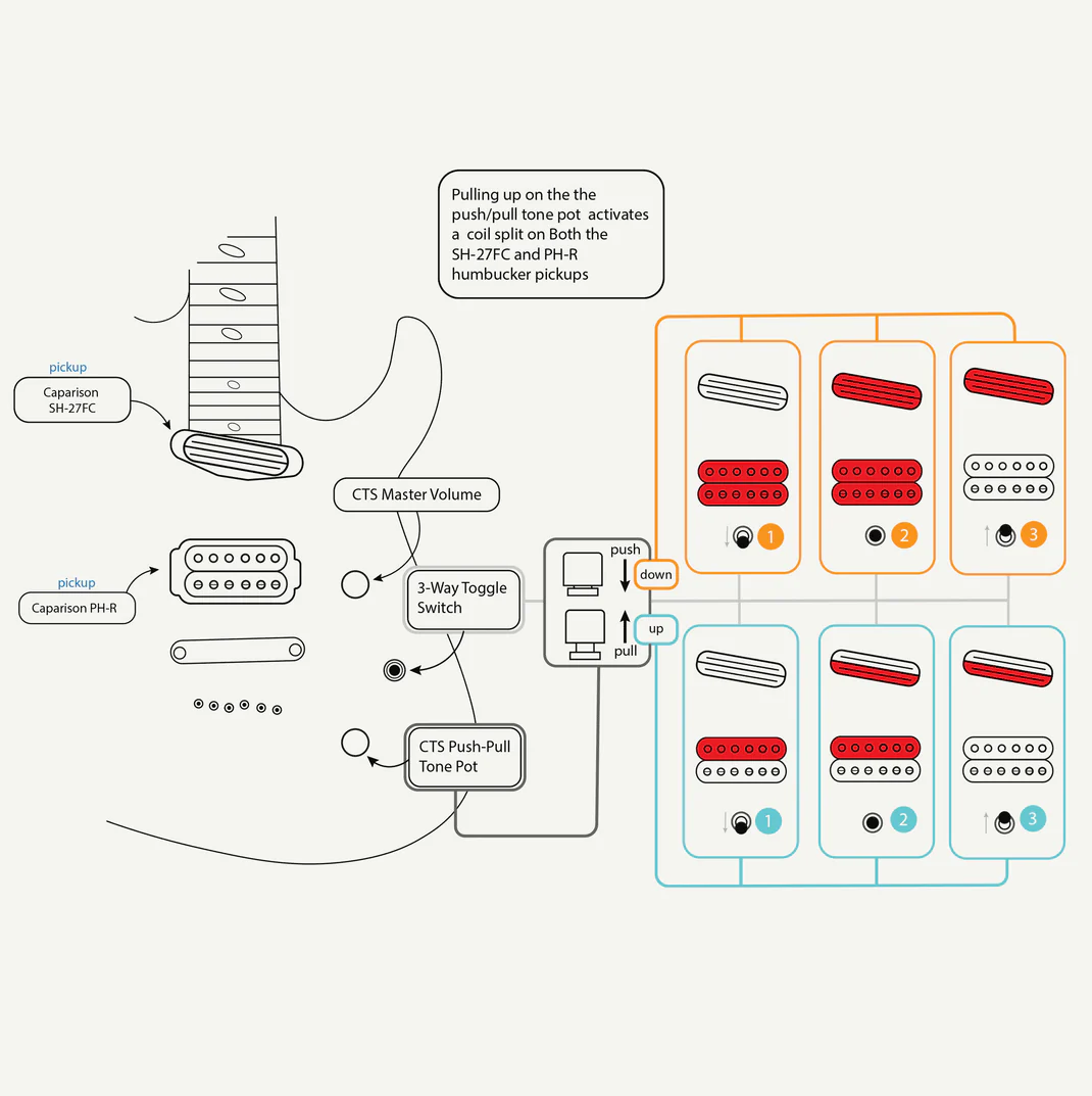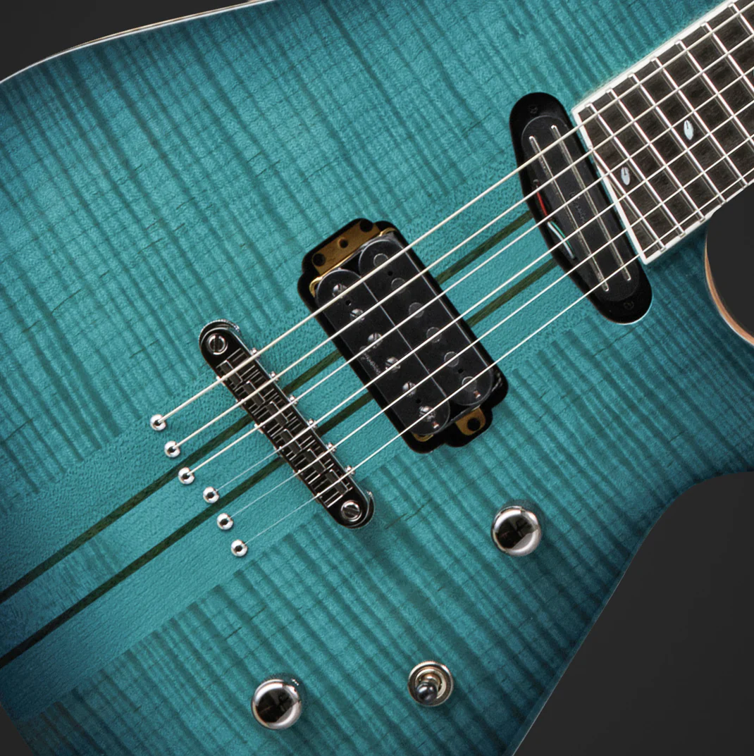 La TAT está equipada con tres pastillas, todas humbucker: dos SH-NC de tamaño single y una humbucker PH-R, que ofrecen una versatilidad tonal excepcional. Para aprovechar al máximo esta configuración única, incorpora un selector de pastillas Schaller Mega Switch «M» de 5 posiciones. A diferencia de un selector de 5 posiciones estándar, este selector permite combinaciones de bobinas que normalmente no son posibles, lo que permite una amplia variedad de sonidos, desde limpios brillantes hasta solos agresivos.