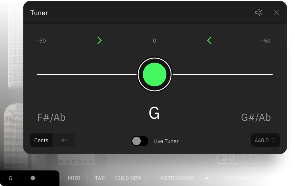 Afinador en vivo adicional que se muestra en la parte inferior de la interfaz de usuario.