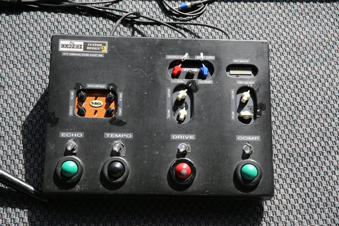 Las guitarras de Pete se conectan a una caja Pete Cornish AC Powered 3 Way Split, y luego a una pedalera Cornish hecha a medida. Dentro hay solo tres circuitos, extraídos de sus cajas y cableados por Cornish: un T-Rex Effects Replica, un Boss OD-1 y un Demeter Compulator. El predecesor de Simon Law, Alan Rogan, técnico de Townshend de toda la vida, encargó a Cornish construir dos de estos; el repuesto queda a mano en caso de emergencia. La pedalera también está equipada con una fuente de alimentación y un circuito de búfer de primera categoría, además de los elegantes botones de pedal estilo «Dr. Who».