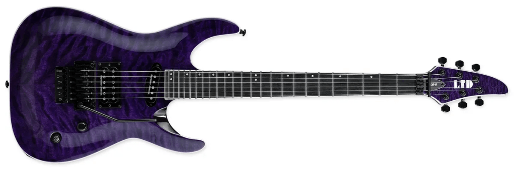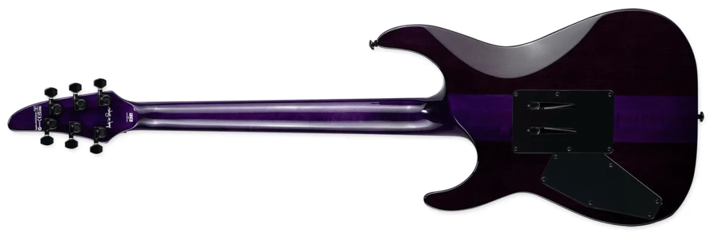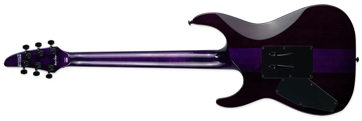 El modelo de LaRocque es más metal clásico, lo que esperarías de un músico cuyo trabajo diario implica tocar con King Diamond. Acabado en un majestuoso See-Thru Purple y arce acolchado, tiene una forma de cuerpo MH, un híbrido de estilo S de los modelos Mirage y Horizon de ESP.