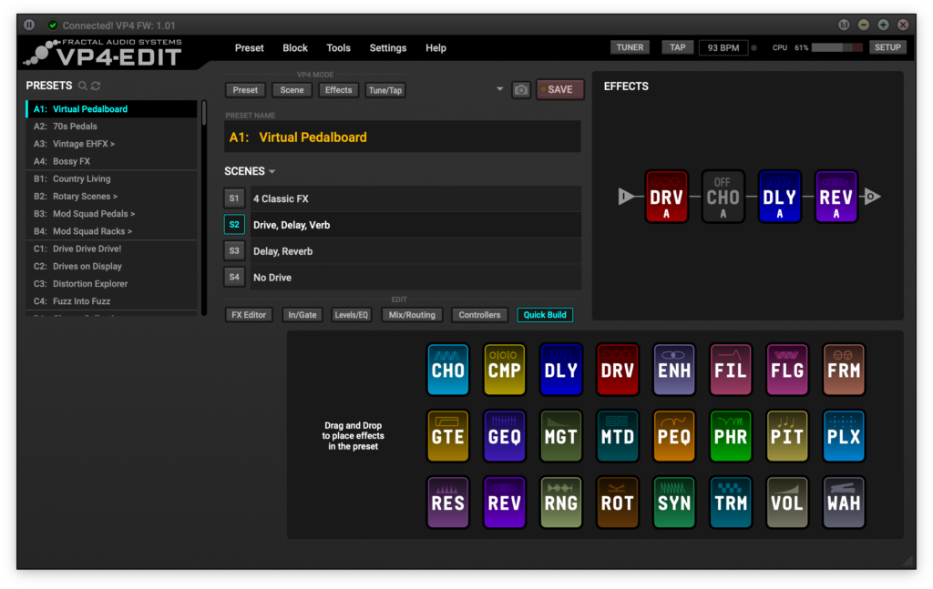 En total, obtienes más de 240 modelos de amplificadores, más de 45 DynaCabs clásicos y modernos, y más de 325 efectos que abarcan desde overdrive y reverb hasta trémolo, delay y mucho más. Al igual que los amplificadores, estos se potencian con algoritmos Axe-Fx III.