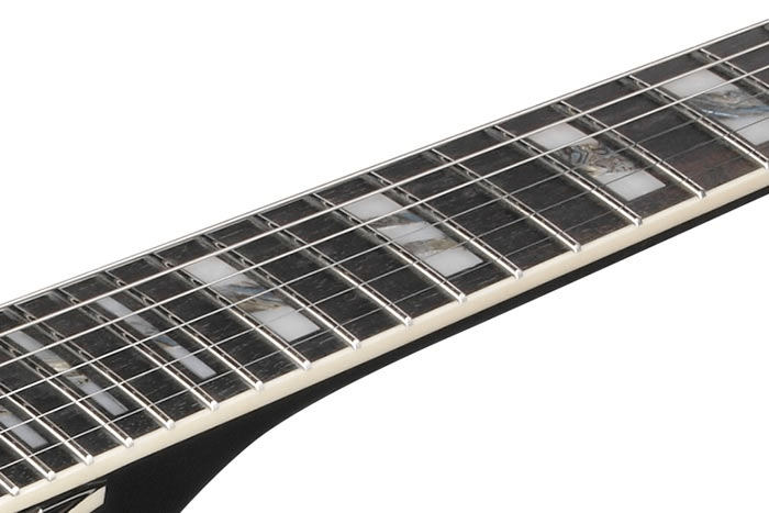 La construcción en sí combina un cuerpo de okoume con un mástil de okoume/arce de tres piezas y un diapasón de ébano con incrustaciones de acrílico y bloques de abulón y 22 trastes estrechos/altos.