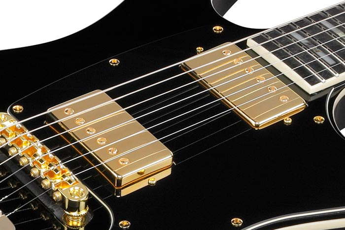 Sus herrajes dorados incluyen un puente Gibraltar Performer con un cordal Quik Change Classic y dos humbuckers pasivas DiMarzio Air Classic.