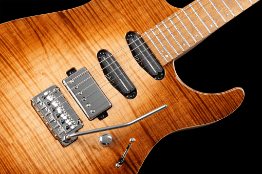 El trémolo Schaller S-FRT II se distingue por su construcción única, en la que el cuerpo del puente y los filos de las cuchillas son componentes separados. Los filos de las cuchillas, que entran en contacto con los pernos, están mecanizados con precisión en ambos lados, lo que proporciona un excelente retorno a cero. Esto minimiza el movimiento innecesario causado por la vibración de las cuerdas y garantiza una alta estabilidad de afinación durante la interpretación.