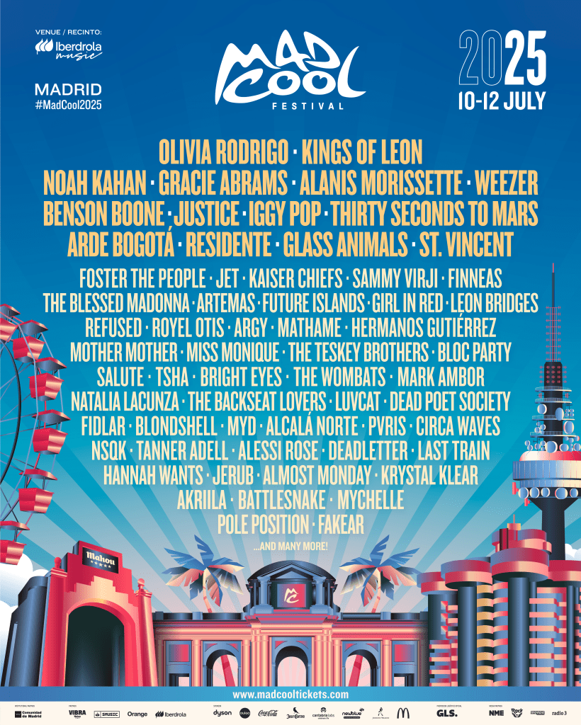 Esta edición de Mad Cool dará inicio el jueves 10 de julio con grandes nombres como Kings of Leon, Gracie Abrams, Iggy Pop y Weezer, entre otrxs. El viernes 11 de julio estará liderado por los ya mencionados Nine Inch Nails además de por Noah Kahan, Alanis Morissette y Benson Boone, mientras que el sábado 12 de julio serán Olivia Rodrigo, Justice, Arde Bogotá y Thirty Seconds to Mars que encabezarán el line-up del festival. Los ganadores de las iniciativas ‘Mad Cool Talent by Vibra Mahou’ y ‘Mad Cool DJ Talent by Vibra Mahou’ completarán el cartel, ofreciendo a las bandas y DJs emergentes la oportunidad de presentarse en un escenario de proyección global.