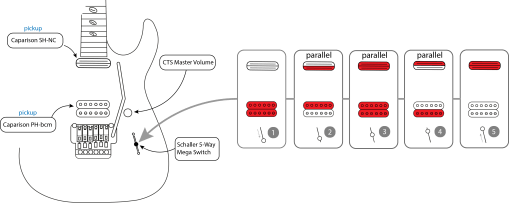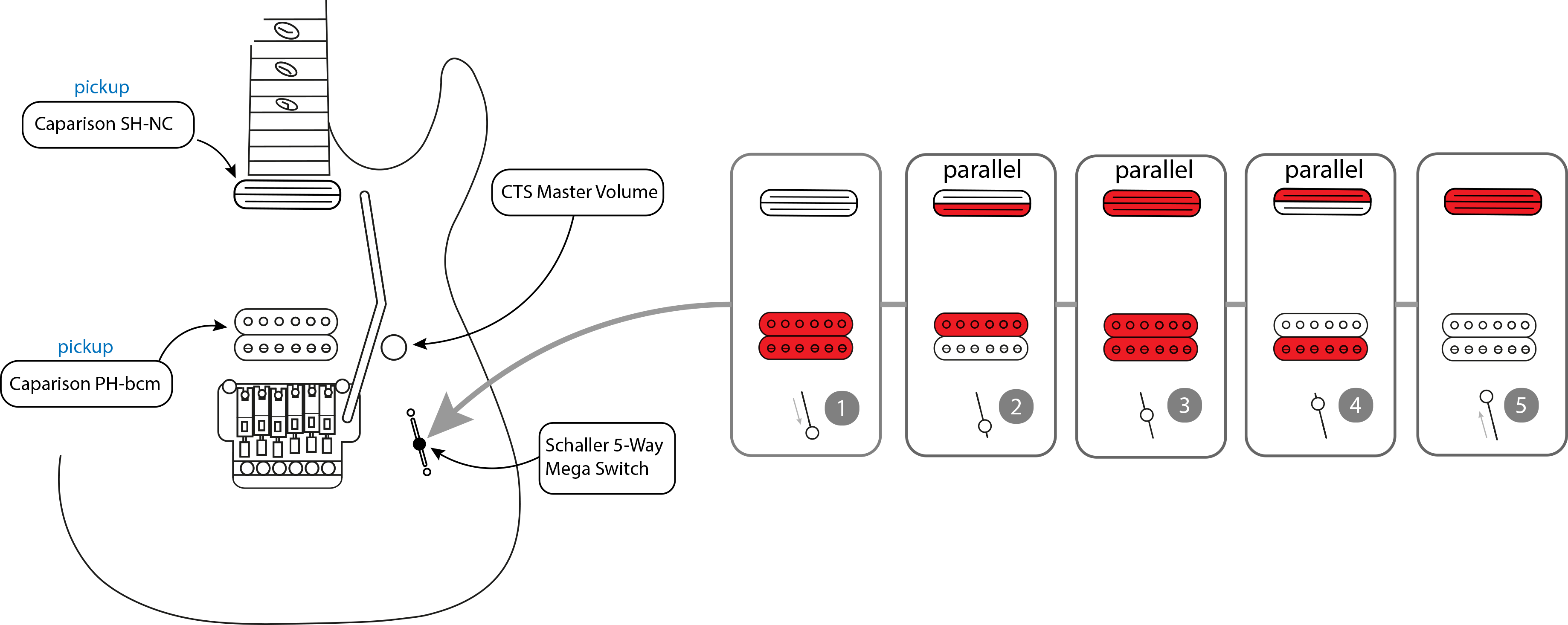 La TAT está equipada con tres pastillas, todas humbucker: dos SH-NC de tamaño single y una humbucker PH-R, que ofrecen una versatilidad tonal excepcional. Para aprovechar al máximo esta configuración única, incorpora un selector de pastillas Schaller Mega Switch «M» de 5 posiciones. A diferencia de un selector de 5 posiciones estándar, este selector permite combinaciones de bobinas que normalmente no son posibles, lo que permite una amplia variedad de sonidos, desde limpios brillantes hasta solos agresivos.
