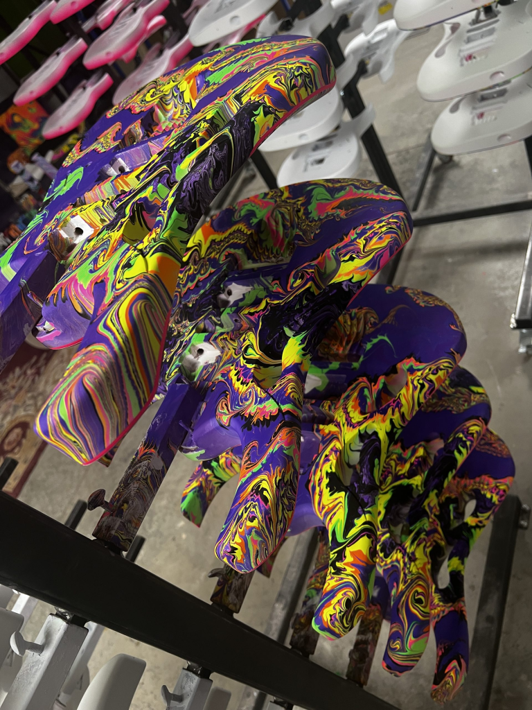 Más de 2000 horas a lo largo de 55 semanas, 8 kilos de pigmento luminescente, 400 onzas de pintura acrílica, creando aproximadamente 6840 círculos de colores en 180 guitarras más tarde…la serie de PIA77 está terminada. Es bueno haberlo terminado, pero me encantó cada segundo de esa mierda. Realmente un honor y un privilegio.