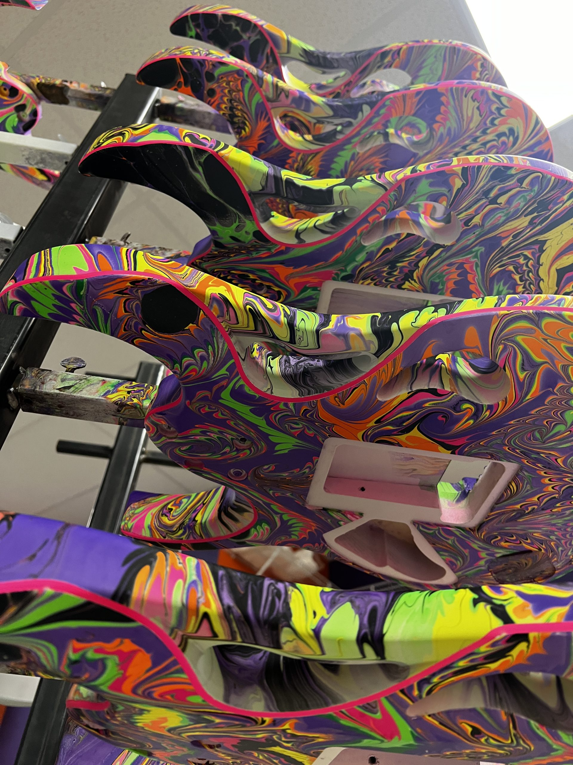 Algunos de los colores que mezclo para el dibujo final también son fluorescentes, por lo que las guitarras reaccionan a la luz negra y la falta de opacidad de muchos de los colores utilizados, lo permite que la capa base fosforescente se cargue y, por lo tanto, brille cuando se carga y se lleva a un lugar oscuro.