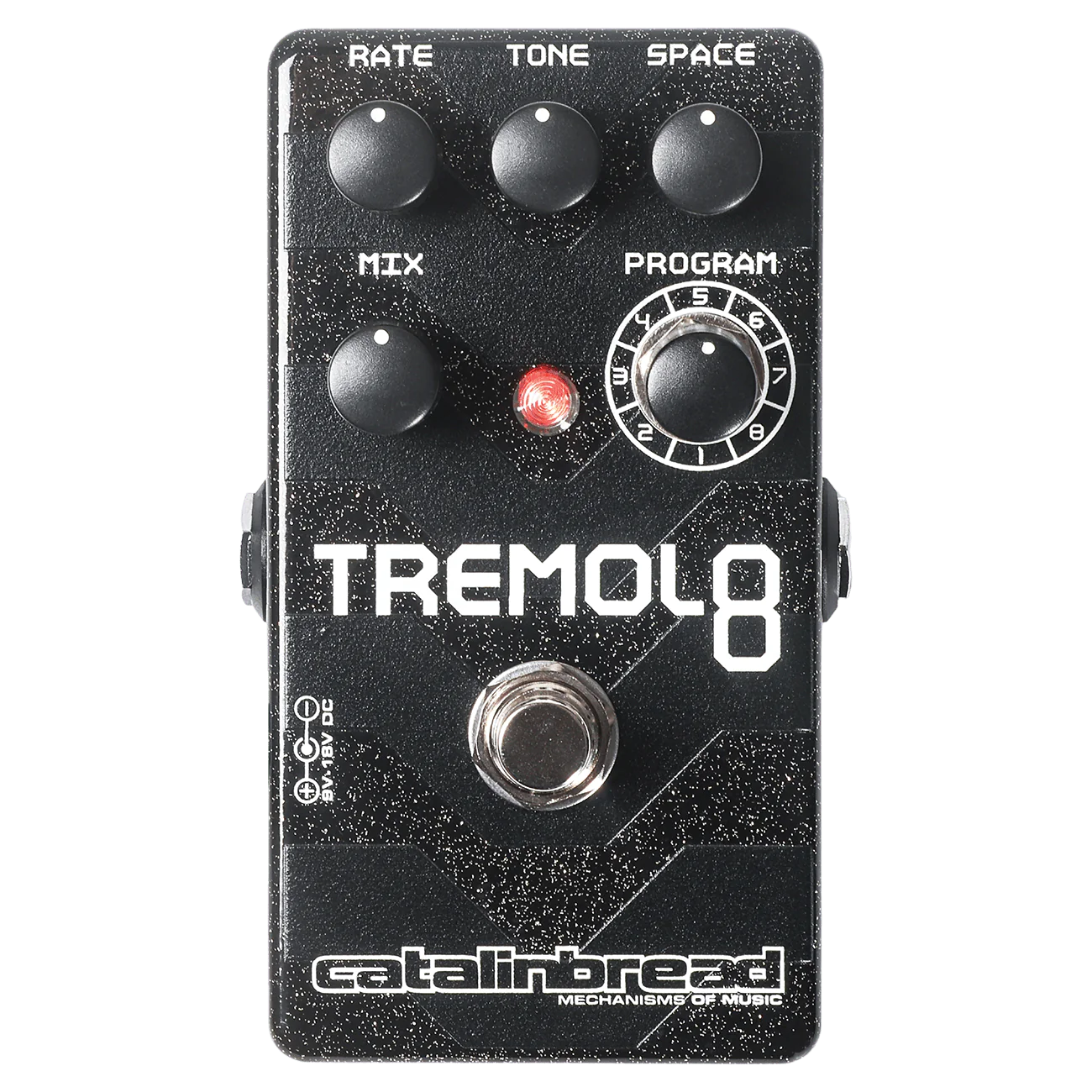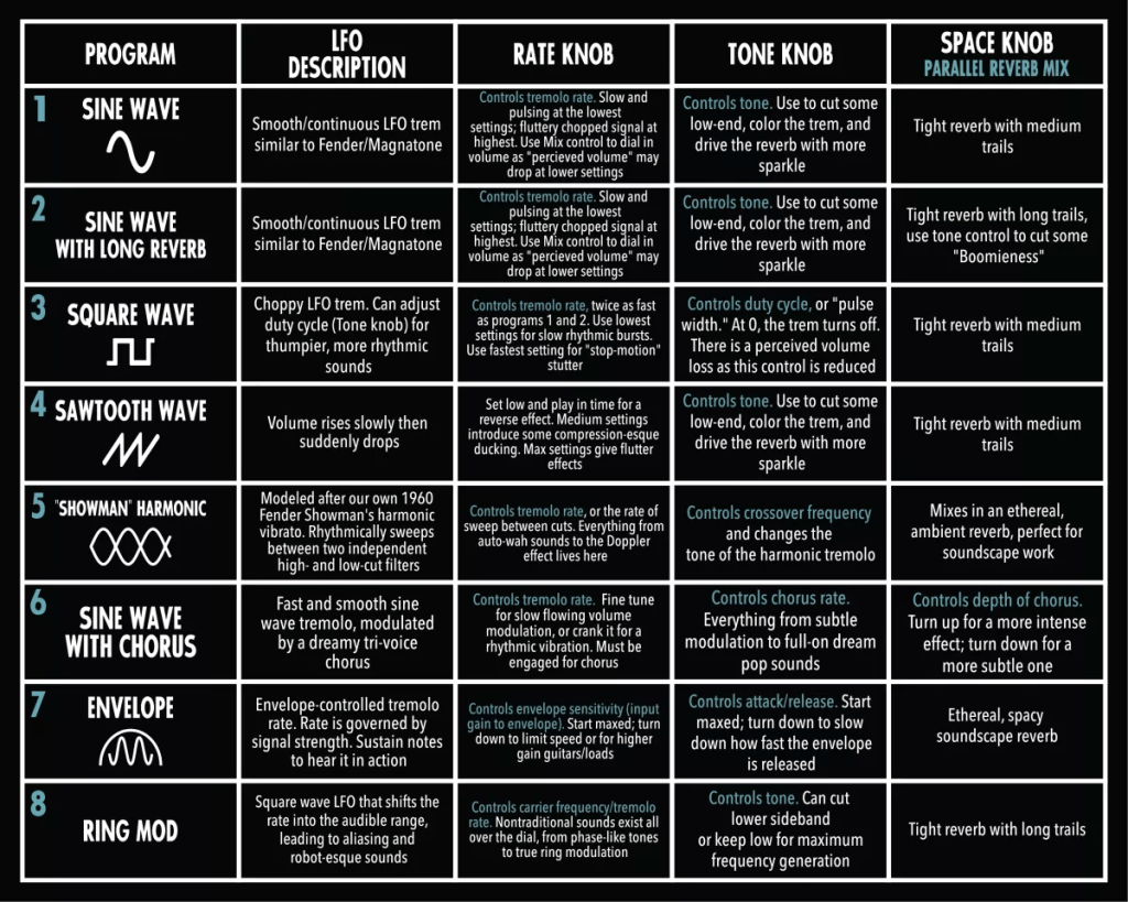Hay tres combinaciones diferentes de reverb y trémolo para elegir utilizando un pequeño interruptor DIP. Para empezar, está el SS (Spring Reverb and Sine Tremolo), un reverb de muelles tradicional combinado con un trémolo sinusoidal. Después, está el PH (Plate Reverb and Harmonic Tremolo), un reverb de placas combinada con un trémolo armónico, que suena bastante interesante. Y el PV (Plate Reverb and Pitch Vibrato), un reverb de placas combinado con un vibrato de tono para todos tus deseos de Lo-Fi.