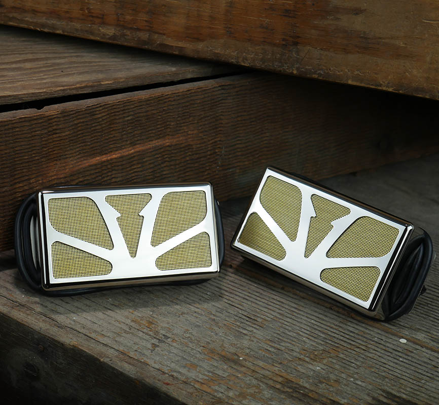 Si estuviste en Anaheim este invierno, puede que ya las hayas visto. Lollar las presentó en la NAMM, atrayendo la atención de figuras como Mateus Asato. Para empezar, no se parecen en nada a un juego de pastillas de repuesto para Strat. Lollar las aloja en un anillo metálico abierto, dándoles un aire dorado gracias a un llamativo inserto de malla.