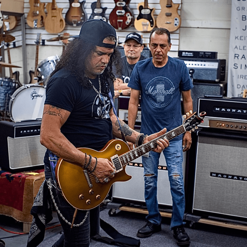 «Me he convertido en un gran admirador del sonido Magnatone», añade Slash. “Y ha sido un honor ayudar a diseñar un amplificador de 100 vatios con ellos. Creo que juntamos el tono y la claridad de Magnatone con un poco de potencia y crujido. La combinación es agresiva y dulce al mismo tiempo, es bastante impresionante”.