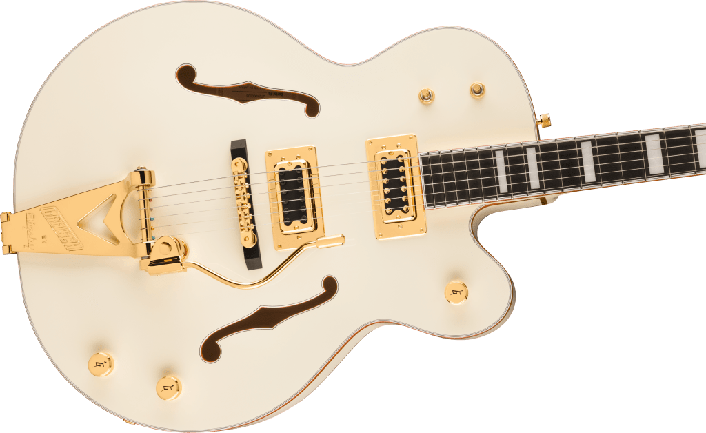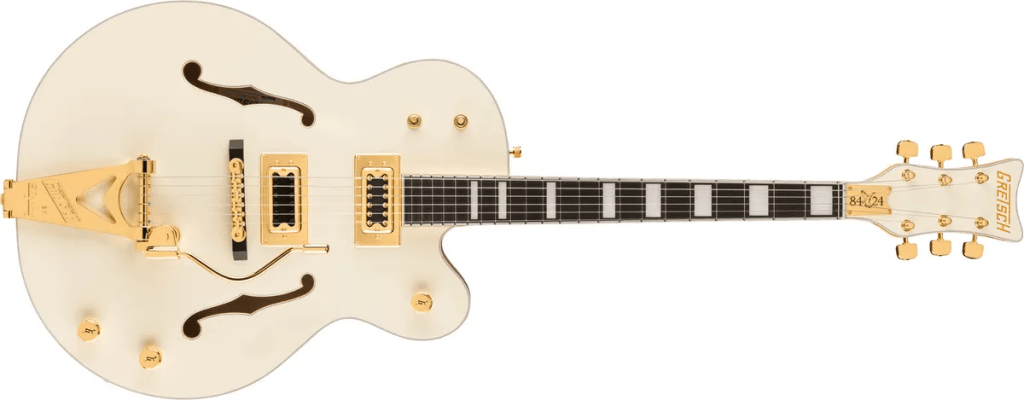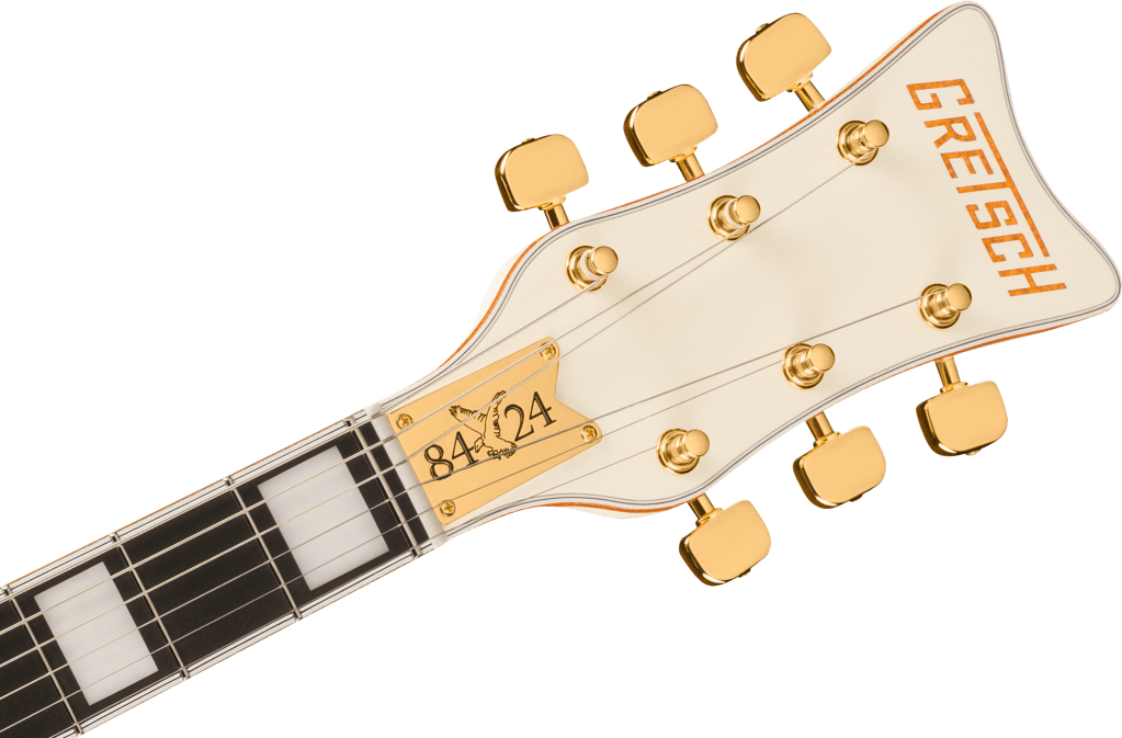 La nueva Falcon de Duffy celebra los 40 años de The Cult, de ahí la designación, G8424T. Tiene un acabado en blanco vintage. El hardware incluye un cordal vibrato Bigsby B6GW, un puente Adjusto-Matic y un juego de Grover Imperials FTW.